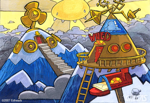 After our successful collaboration on Edheads’ Simple Machines, it was time to tackle yet another exciting topic- weather! Edheads founder, Eric Bort, challenged me with designing Edheads’ newest resident, Miss Weatherhead, and her two mountaintop weather observatories. The activity contains two modules, Predict the Weather and Report the Weather, in which visitors are asked to assist the precocious Miss Weatherhead in her weather predictions by using her supercomputer, the Predict-o-Matic, and then broadcasting the results on the Edheads television station, WHED.