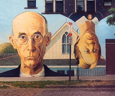 "The mural that threatened to dethrone Mona Lisa as ruling artwork of the area is the 2002 reproduction of Grant Wood's equally iconic masterpiece American Gothic. Passersby often pose for pictures with this piece with a twist - the woman has been turned on her head. On the corner of Lincoln and High Streets opposite R. J. Snappers, the retro American Gothic is beautifully reproduced by Steve Galgas and Mike Altman, yet makes a statement of its own."- Kaizaad Kotwal