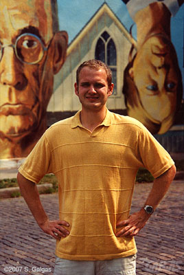 The Columbus developer who commissioned the Short North’s well-known sideways Mona Lisa mural ten years earlier, asked Mike Altman and I to paint a new mural for the Short North in June 2002. We decided to continue the theme of giving an iconic painting an irreverent twist using Grant Wood’s American Gothic. Two weeks after laying the first brushstrokes, the mural was completed, bringing another instant landmark to the area and further establishing the Short North’s quirky and eclectic reputation.